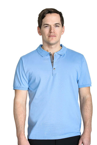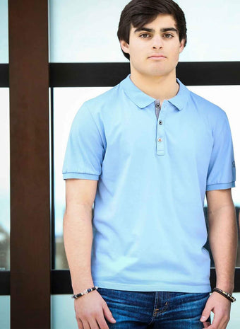 A casual piece that emphasizes strong, simple lines and high quality fabric. 100% Cotton Jersey with ribbed cuff and collar. Colorful trim on inner placket.