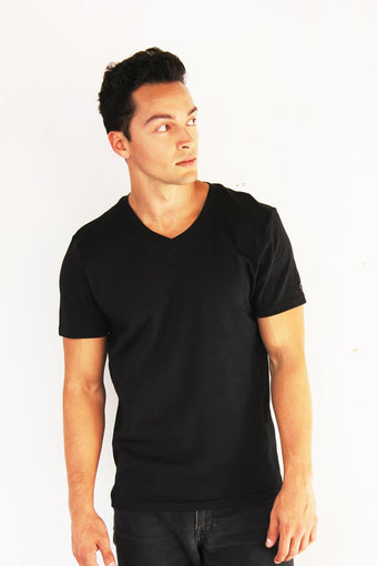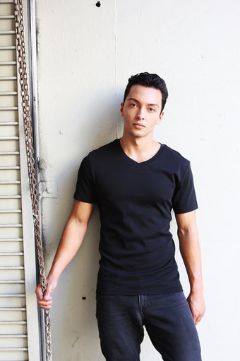 An eye-catching V-neck cut that is powerful enough to stand alone and understated enough to pair with a dinner jacket for a statement in casual elegance. 100% Liquid Feel Cotton for a silky soft feel and high luster. Side panels of 100% Liquid Feel Cotton Rib create long, shaded vertical lines to visibly lean and lengthen your look, while retaining its perfect shape as your body flexes and moves comfortably.